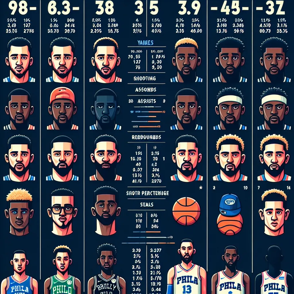 1. **Очки за игру (PPG):** В сезоне 2022-2023 у "Бруклин Нетс" лидером по очкам был Кевин Дюрант, в то время как у "Филадельфия Севенти Сиксерс" - Джоэл Эмбиид.2. **Подборы за игру (RPG):** Джоэл Эмбиид из "Севенти Сиксерс" обычно лидирует по подборам, в то время как у "Нетс" в этом компоненте выделялся Ник Клэкстон.3. **Передачи за игру (APG):** Джеймс Харден из "Севенти Сиксерс" был одним из лучших ассистентов, в то время как у "Нетс" в этом аспекте выделялся Бен Симмонс.